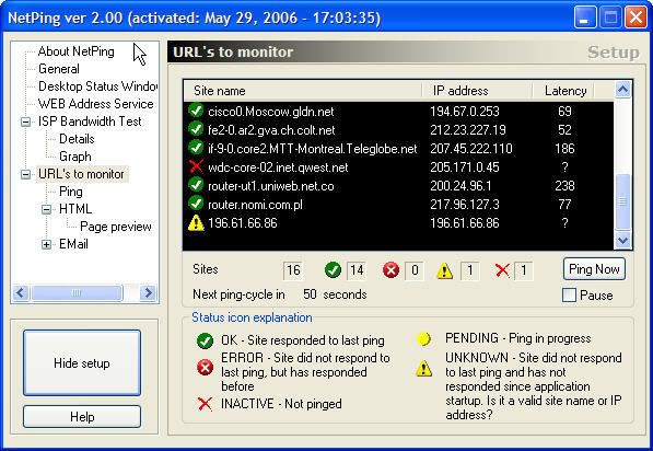 Ping Utility - NetPing v2.01 has been established for the sole purpose of giving the status of ADSL internet connection. It will indicate how in the tray on the desktop (if included) and sound (if enabled) any change in status. You can also enter events leading file a detailed way your service provider gives you.