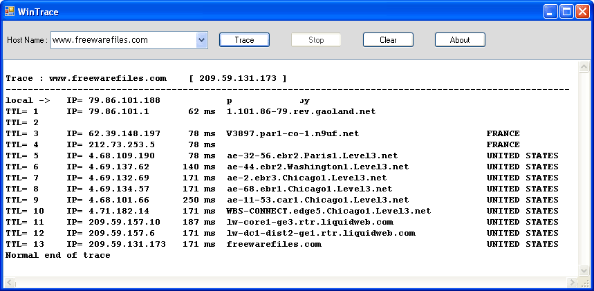 Ping Utilities - Wintrace / Traceroute program; useful to view the routing information of a Web site (informations displayed: IP address, response time, hostname and country). Enter a Web address or a valid host name, e.g. http://www.google.com or google.com, or a valid IP address, e.g. 72.14.207.99.