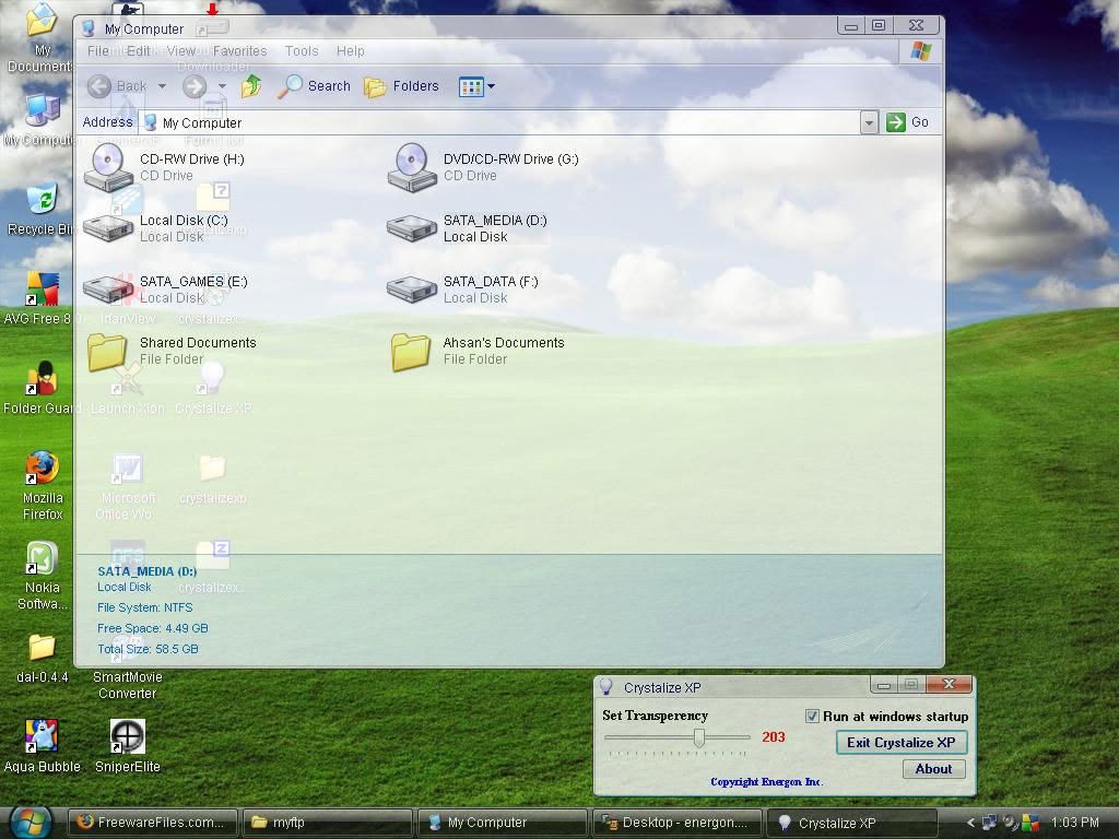 Crystalize XP is a small utility that provides explorer level transperency for Windows XP, Currently available in Microsoft Windows Vista.