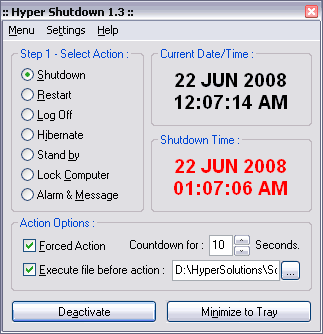 Optionally, It can also forcefully terminate all running processes before performing the selected action. The new Alarm feature supports all popular Audio and Video formats such as mp3, wav, wma, avi, mpg.