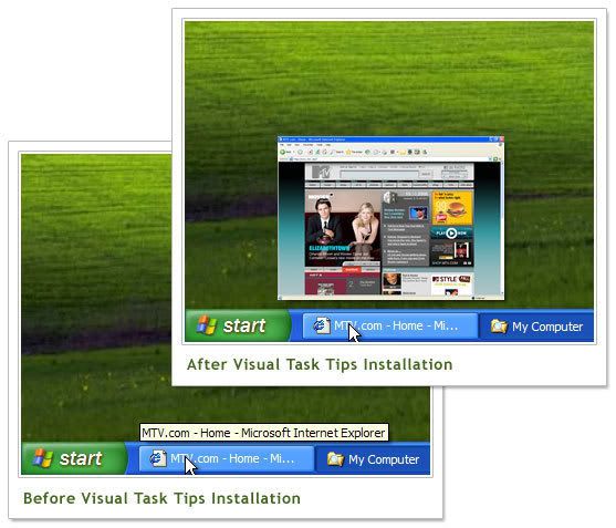 Visual Task Tips was designed to be a simple lightweight shell enhancement utility. It provides a thumbnail preview image for each task in the Windows Taskbar, like in Microsoft Windows Vista.