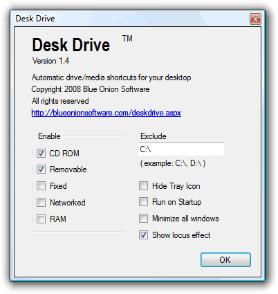 Desk Drive sits quietly in the system tray. Configuration (image at right) is just a click away and allows you to specify which types of media to monitor. So simple, it just works. Download it today!